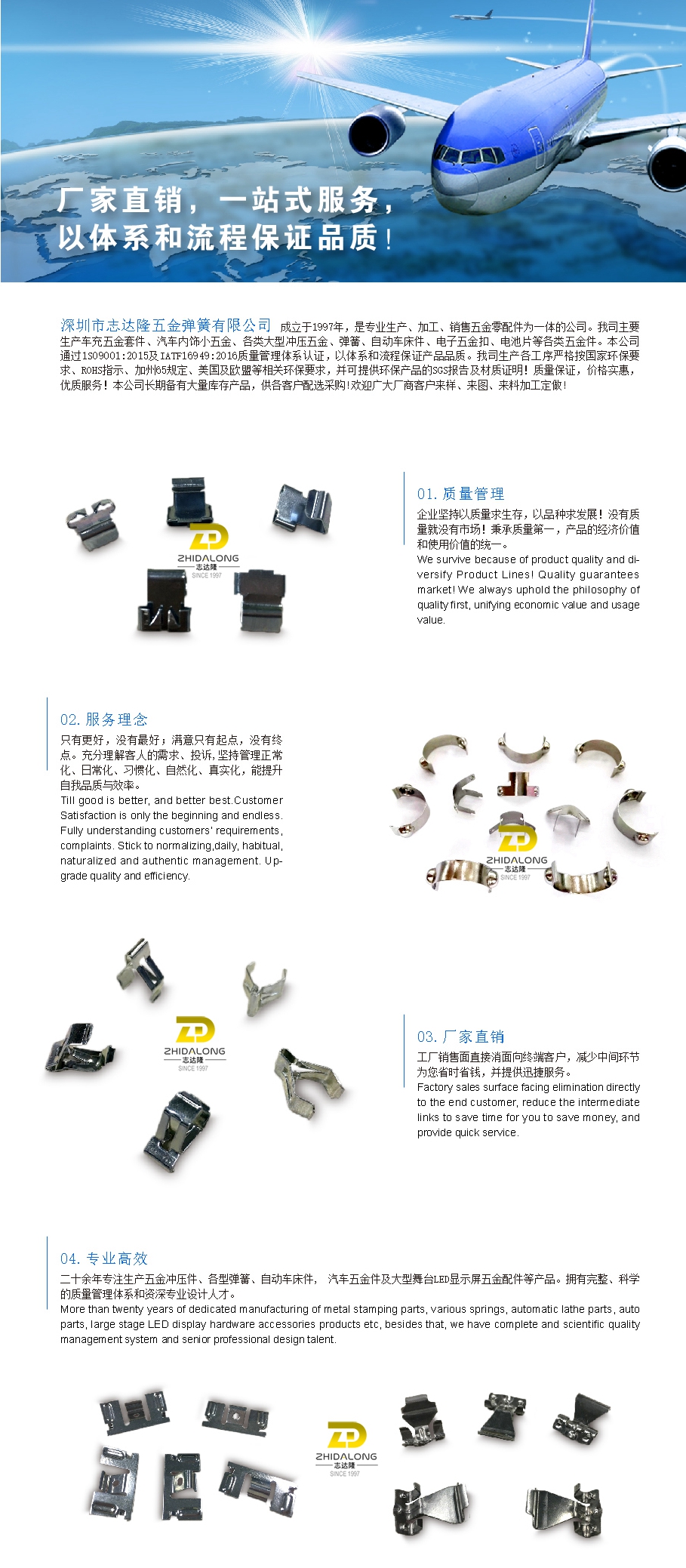 深圳市志达隆五金弹簧有限公司成立于1997年, 是专业生产五金冲压件、各型弹簧、自动车床件, 汽车五金件及大型舞台LED显示屏五金配件等产品的私营独资企业。公司拥有完整、科学的质量管理体系. 2017年获ISO9001:2015证书更新及通过汽车行业体系IATF16949:2016认证。注册资金1千万人民币。