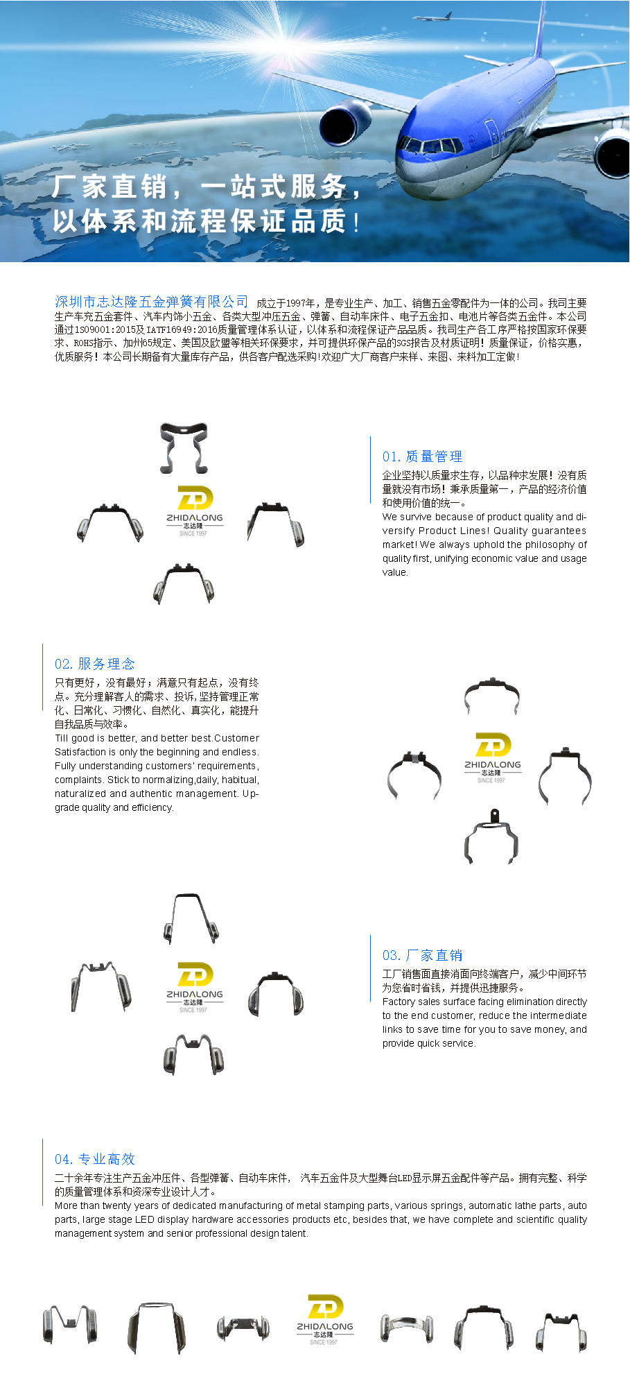 深圳市志达隆五金弹簧有限公司成立于1997年, 是专业生产五金冲压件、各型弹簧、自动车床件, 汽车五金件及大型舞台LED显示屏五金配件等产品的私营独资企业。公司拥有完整、科学的质量管理体系. 2017年获ISO9001:2015证书更新及通过汽车行业体系IATF16949:2016认证。注册资金1千万人民币。