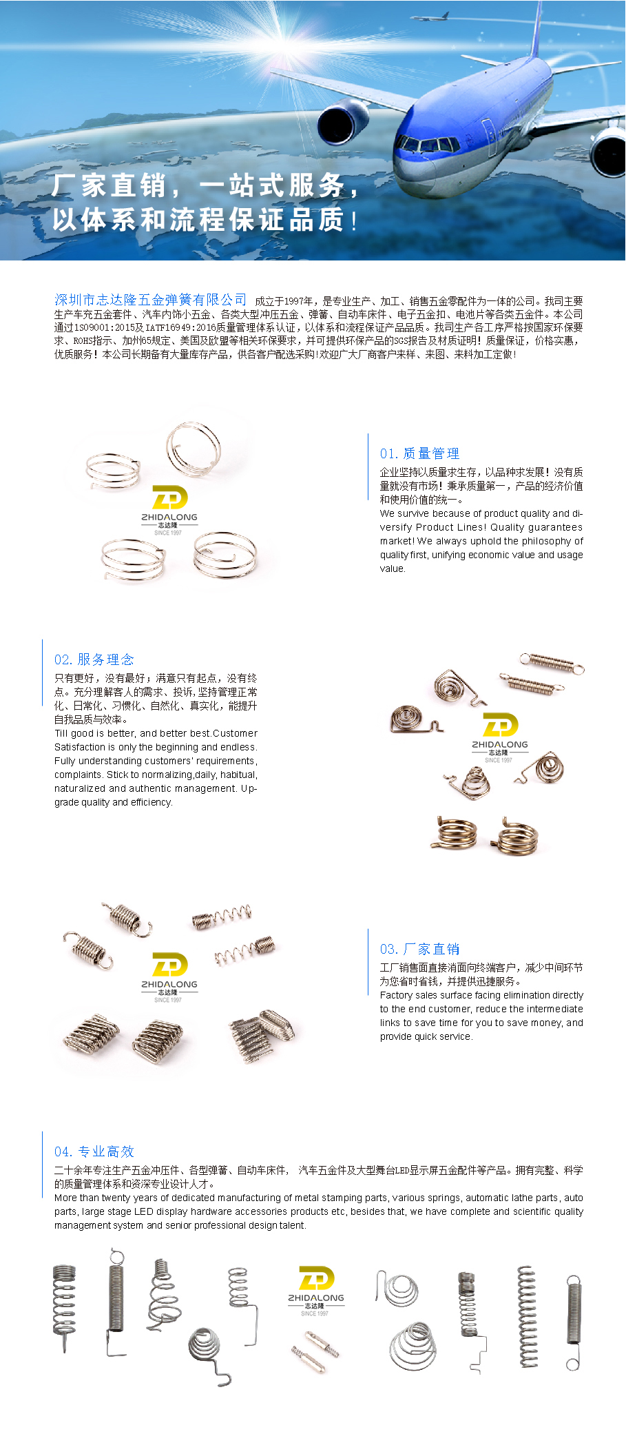 深圳市志达隆五金弹簧有限公司成立于1997年, 是专业生产五金冲压件、各型弹簧、自动车床件, 汽车五金件及大型舞台LED显示屏五金配件等产品的私营独资企业。公司拥有完整、科学的质量管理体系. 2017年获ISO9001:2015证书更新及通过汽车行业体系IATF16949:2016认证。注册资金1千万人民币。